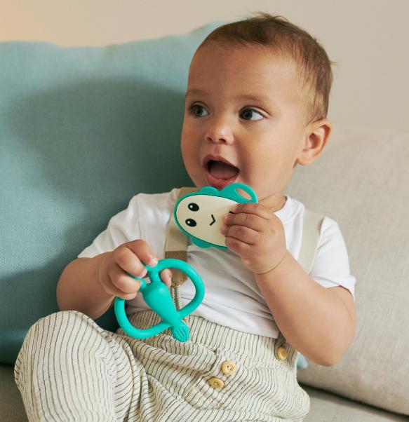 The animal teether containing BioCote Antimicrobial Technology. The bumps on the head help to massage hard to reach molars. The easy grip arms help develop fine motor skills and enable little one to self sooth.
