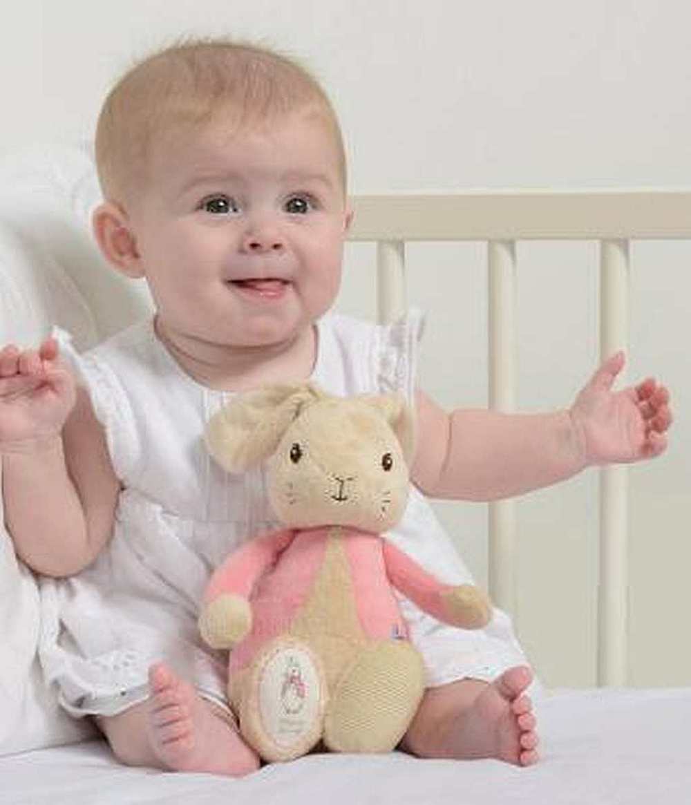 From the classic Beatrix Potter books, this beautiful Flopsy Bunny soft toy is made from premium soft plush to ensure she is as gentle against babies skin as can be. Flopsy is as seen in the original illustrations and is wearing her signature pink jacket with a cute embroidered butterfly motif. Flopsy has embroidered facial features, a cute Flopsy bunny logo on her foot and is machine washable so makes a perfect as a gift for newborns or decoration piece for nurseries.